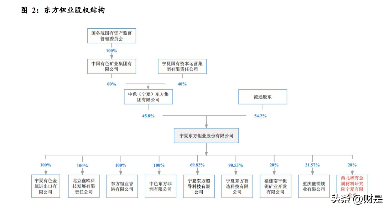 公司股权结构稳定,实际控制人为央企中国有色矿业有限责任公司。国务院国有资 产监督管理委员会依托中国有色矿业集团有限公司,间接控制中色东方集团有限公 司(持有 60%股权),进而控制东方钽业。截至 2022 年,中色东方持有东方钽业 45.8% 股权。