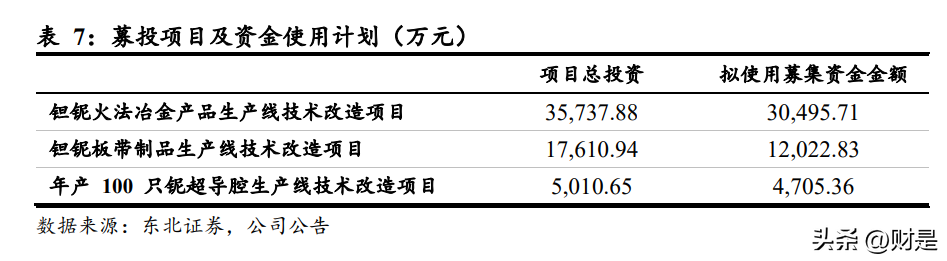东方钽业本轮拟向特定对象发行股票募集 6.7 亿元。募集资金用于三个固定资产投 资项目,包括钽铌火法冶金产品生产线技术改造项目(火法冶金项目)、钽铌板带制 品生产线技术改造项目(制品项目)、年产 100 只铌超导腔生产线技术改造项目(铌 超导腔项目),剩余资金用于补充流动资金。