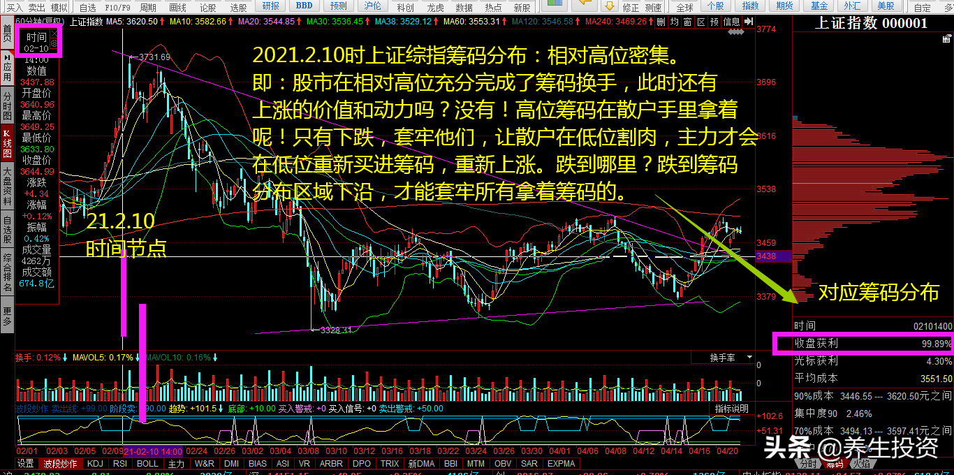 2021.2.10时上证综指筹码分布:相对高位密集。即:股市在相对高位充分完成了筹码换手,此时还有上涨的价值和动力吗?没有!高位筹码在散户手里拿着呢!只有下跌,套牢他们,让散户在低位割肉,主力才会在低位重新买进筹码,重新上涨。跌到哪里?跌到筹码分布区域下沿,才能套牢所有拿着筹码的人。