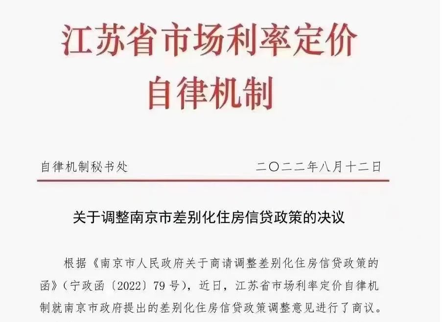 8月12日,南京发布关于《关于调整南京市差别化住房信贷政策的决议》(以下简称“决议”),江苏省市场利率定价自律机制同意南京市政府提出的差别化住房信贷政策调整政策。