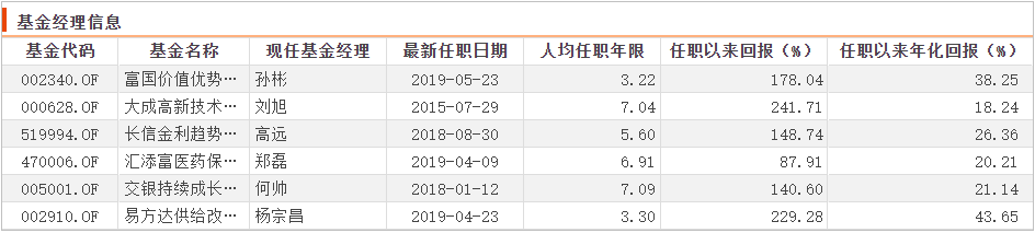 6位基金经理的上任时间、任职回报情况见下表。