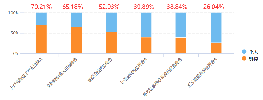 ,由高到低分别是70.21%(刘旭)、65.18%(何帅)、52.93%(孙彬)、39.89%(高远)、38.84%(杨宗昌)、26.04%(郑磊),都不算低,都可以说这六位基金经理都是机构相对比较认可的基金经理。