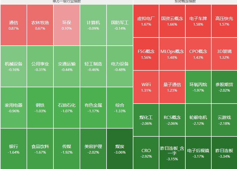 分行业来看,仅有通信、农林牧渔、环保三大行业是涨的,煤炭、美容护理、传媒、食品饮料、银行等行业领跌。