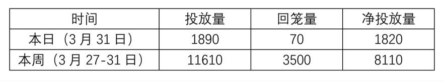 3月31日,央行公告称,为维护季末流动性平稳,3月31日以利率招标方式开展了1890亿元7天期逆回购操作,中标利率2.0%。