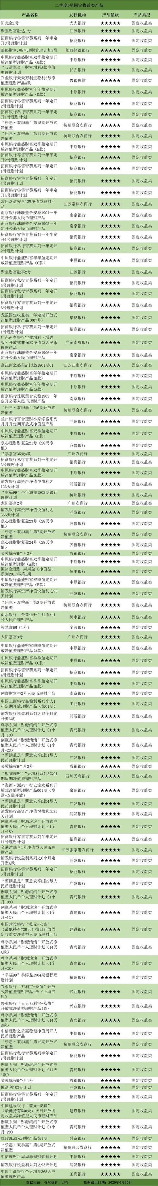 获评一年期5星固定收益类产品的发行机构包括工商银行、建设银行、招商银行、兴业银行、浦发银行、中信银行、光大银行、华夏银行、邮政储蓄银行等32家银行及理财子公司。获评5星产品较多的产品系列有招商银行青葵系列,中原银行鼎盛财富系列,青岛银行“财源滚滚”系列,浦发银行悦盈利系列,杭州联合农商行“乐惠·双季赢”系列,南京银行的珠联璧合安稳系列等。