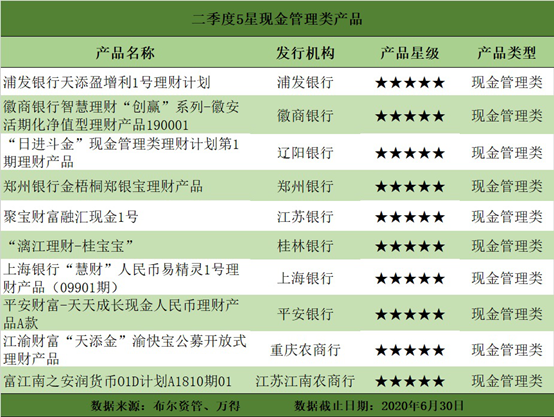 获评5星的10只现金管理类产品包括浦发银行的天添盈增利1号理财计划、徽商银行的智慧理财“创赢”系列-徽安活期化净值型理财产品190001、辽阳银行的“日进斗金”现金管理类理财计划第1期理财产品、郑州银行的金梧桐郑银宝理财产品、江苏银行的聚宝财富融汇现金1号、桂林银行的“漓江理财-桂宝宝”、 上海银行的“慧财”人民币易精灵1号理财产品(09901期)、平安银行的平安财富-天天成长现金人民币理财产品A款、重庆农商行的江渝财富“天添金”渝快宝公募开放式理财产品、江苏江南农商行的富江南之安润货币O1D计划A1810期01。