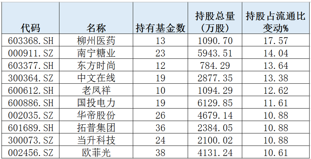 二季度股票型基金最慷慨增持的股票为柳州医药(603368.SH),共有13只基金持有其1090.07万股股份。与一季度相比,二季度持股占流通股比增加了17.57个百分点。上榜的个股中,只有东方时尚(603377.SH)为次新股,二季度持股占流通股比上升了13.64个百分点。
