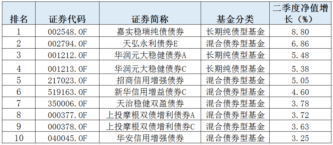 表3:债券型基金二季度业绩前十