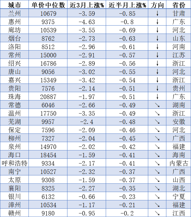 短线跌幅相对略大的有兰州(-0.85%)、惠州(-0.8%)、廊坊(-0.69%)等城市;房价相对平稳的有赣州(-0.2%)、漳州(-0.21%)、银川(-0.23%)等城市。