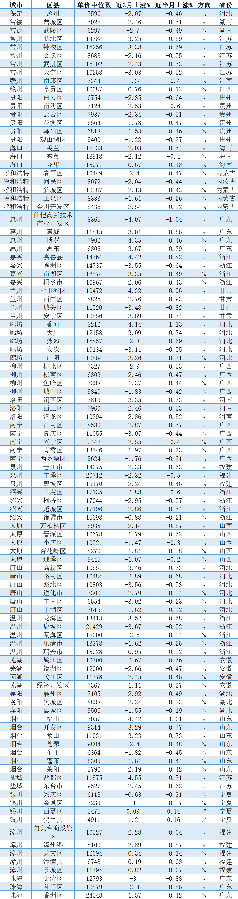 等城市房价跌幅相对略大;银川、赣州、漳州等城市的房价更为平稳。