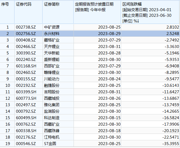 纳入Wind锂矿指数的19家样本公司,今年二季度平均跌幅超过10%,17只成份股下跌,仅有中矿资源(+2.81%)、永兴材料(+2.52%)两家公司取得正收益。