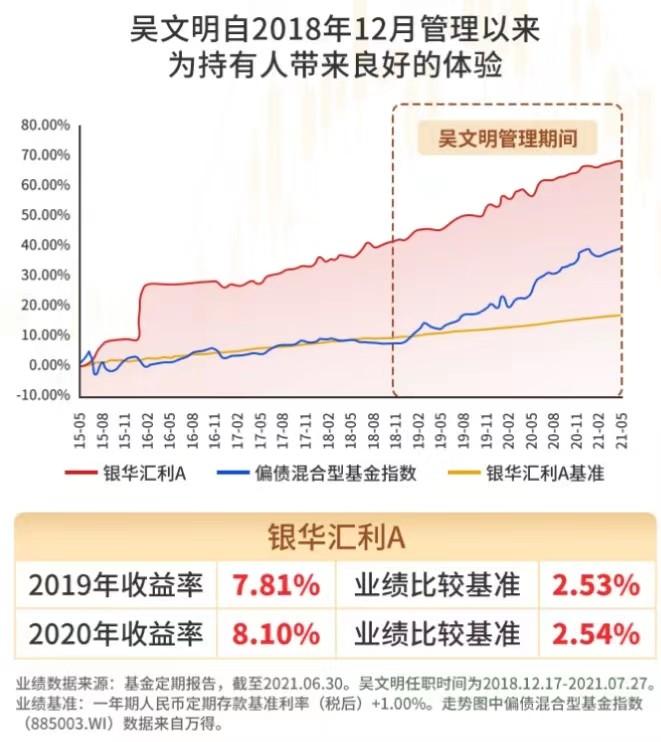数据来源:过去1年/3年/成立以来业绩数据来自基金2021年二季报,截至2021.6.30。年度业绩 数据来自基金年报。业绩基准:一年期人民币定期存款基准利率(税后)+1.00%。走势图中偏债 混合型基金指数(885003.WI) 数据来自万得。本基金成立于2015.5.14。吴文明任职期为 2018.12.17至2021.7.27。风险提示:历史业绩不预示未来。