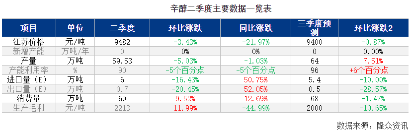 月小幅增加,或在心态上打压买盘心态,下游用户逢低建仓,预计第三季度辛醇市场在