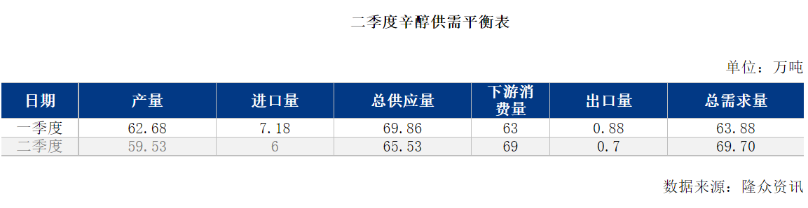 万吨。辛醇市场产量下降主要是山东大厂装置意外停车导致产量下降,其次是华北地区因装置检修造成产量损失。进口量预计较第一季度减少,辛醇总供应量减少