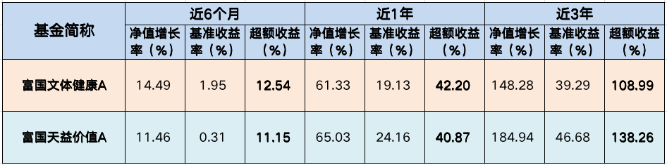 据基金定期报告数据显示,富国文体健康、富国天益上半年分别录得14.49%、11.46%的收益率,同期业绩比较基准收益率分别为1.95%、0.31%,超额收益均超过11%。再往长期看,近三年收益率均超过148%,富国文体健康超额收益超108%、富国天益超额收益达138%。