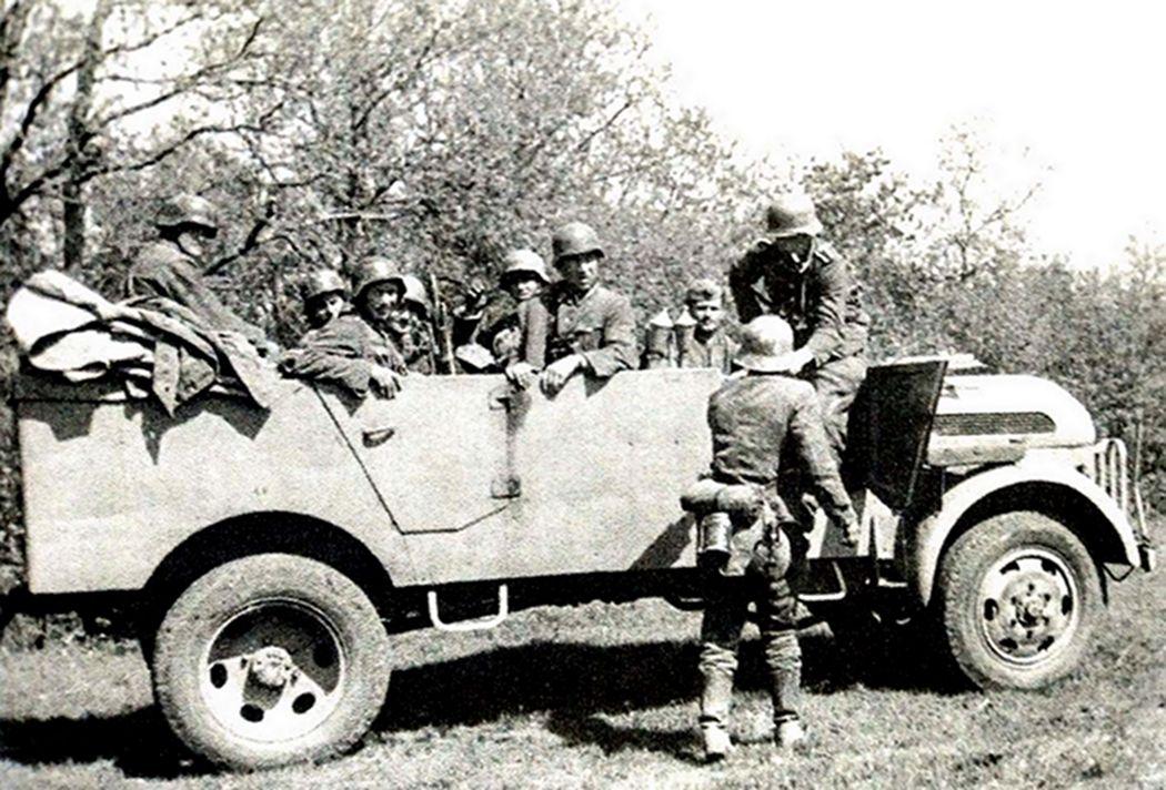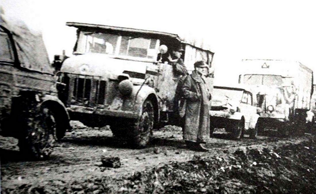 1944年春天,从东线苏联战场后撒的一支德军医疗车队,车队中有斯太尔1500A军用小车,以及大众(VW)和布辛4.5吨卡车。