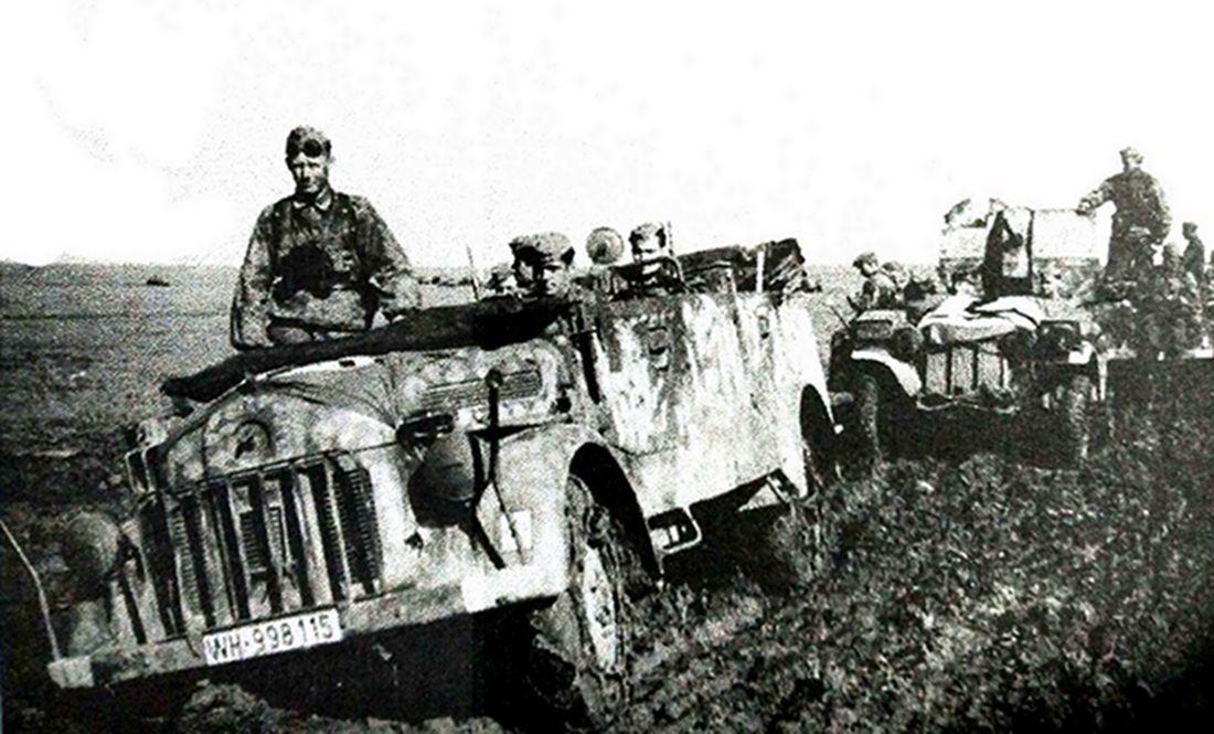 1942年,东线苏联战场,德军第22高炮营车队在南部地区的泥泞路上行进,前面一辆是斯太尔1500A军用指挥车,后面跟着的是一辆牵引着20mm火炮的1吨轻型半履带运输车。