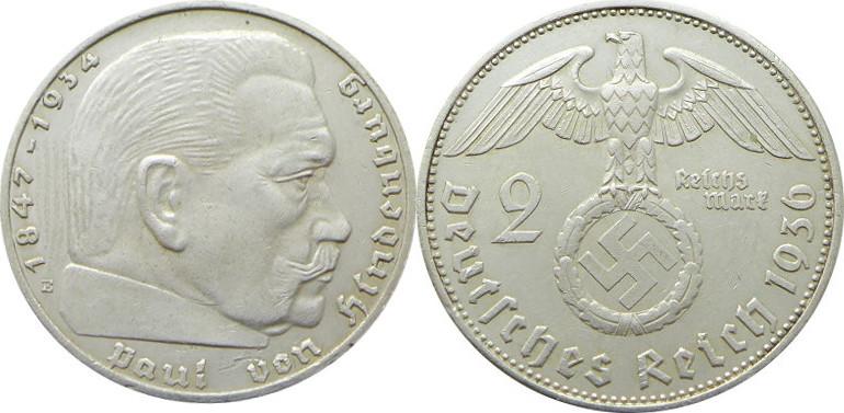 1936年,德国第三帝国,2马克银币。其实德、日两国挑起二战是有必然性的,就是这两个国家的自然资源都比较匮乏,他们必须通过对外扩张来得到更多的资源,所以当战争不顺利时,资源就会紧缺,铸造硬币就会变得困难,这也是他们的硬币在二战中有相似经历的原因。