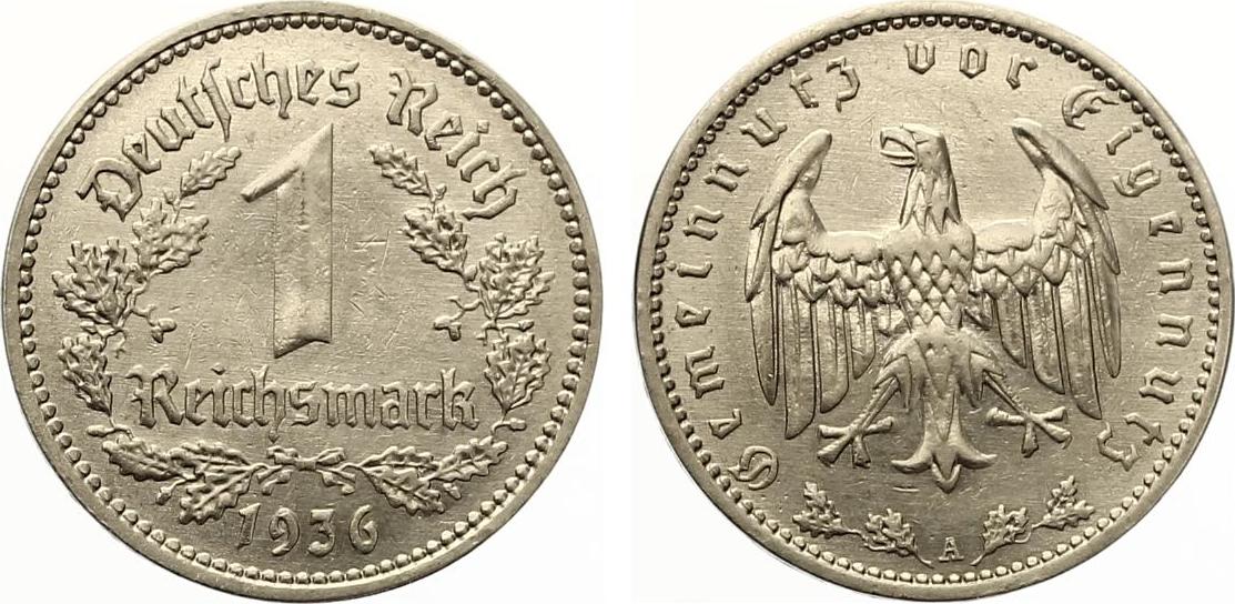 1936年,德国第三帝国,1马克镍币。德国除硬煤、褐煤和盐的储量丰富外,在其他金属和石油能源方面很大程度上依赖进口,德国之所以后来招惹苏联,就是为了高加索的油田。日本也类似,招惹美国也是要东南亚的石油,因为日本侵占中国后,没发现东北大庆的大油田,所以为了支撑战争,就转而瞄向了南方。