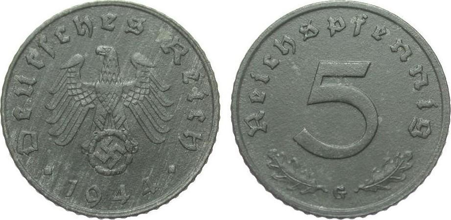 1944年,德国第三帝国,5芬尼硬币,锌材质。