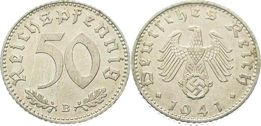 1939年,又重新发行了铝材质的50芬尼硬币,1941年,第三帝国50芬尼铝币。而到了1940年,10芬尼以下面值的硬币,更是改用了锌材质,硬币质量进一步下降。