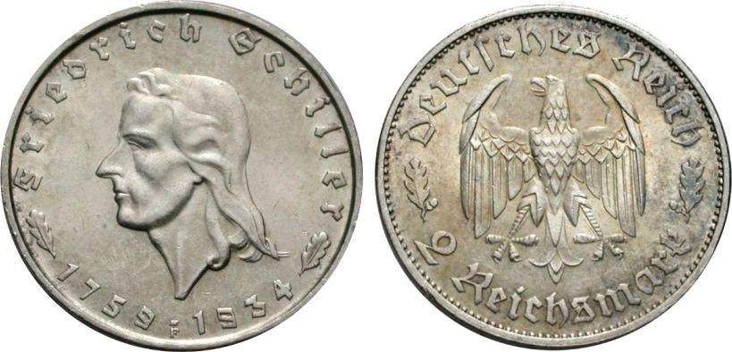 1934年,德国第三帝国,席勒175周年,2马克银币纪念币。席勒是德国著名的文学家。