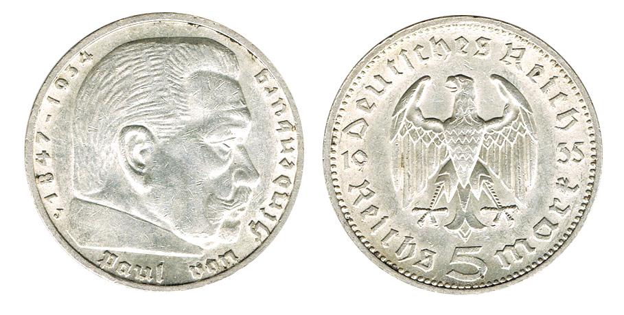 1935年,德国第三帝国,5马克银币。和上面的2马克一样,银币正面的头像是兴登堡元帅,希特勒并没有把自己的头像放倒硬币上。