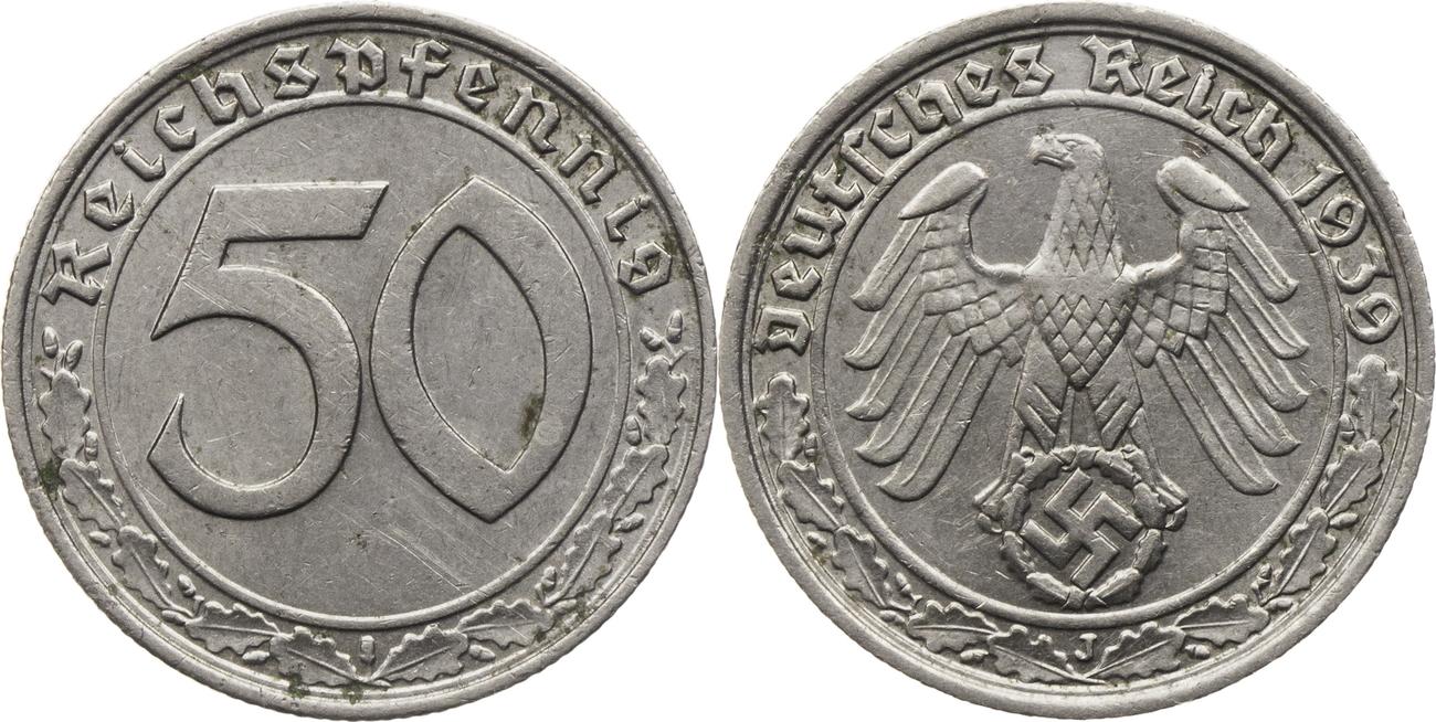 1939年,德国第三帝国,50芬尼镍币,坦克回炉币,由于这种硬币回炉去造坦克了,所以现在留存下来的要少很多,较为珍贵(几百人民币吧)。