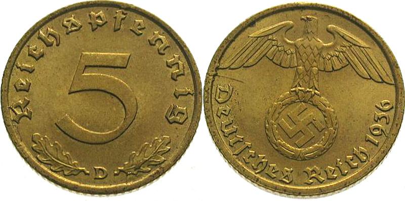 1936年,德国第三帝国,5芬尼硬币,黄铜材质。