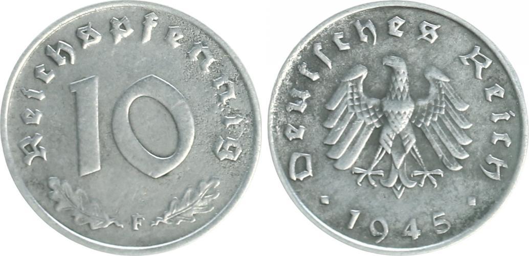 1945年,德国投降,盟军允许德国继续铸造其硬币,以满足人们日常的使用,但是需要把硬币上的纳粹符号去除,因此出现了这种不带纳粹符号的锌质硬币,1945年,德国10芬尼硬币,锌材质,这种临时硬币一直使用到1948年,之后德国分裂,东西德诞生,德国货币分为了东德马克、和西德马克。