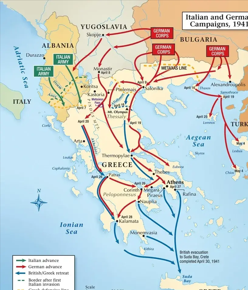 在那位南斯拉夫领导人到达的后一天,科里济斯自杀了;4月20日,埃皮鲁斯和马其顿的希腊将领表示愿意投降。21日,希腊人通知英国人,他们已无法继续作战。22日,英帝国的军队开始撤退。23日,希腊国王和他的大臣们一起撤退到克里特岛。24日,保加利亚人入侵希腊,从德国人手里接管了马其顿东部。25日,德国军队占领利姆诺斯岛。27日,德军进入雅典。