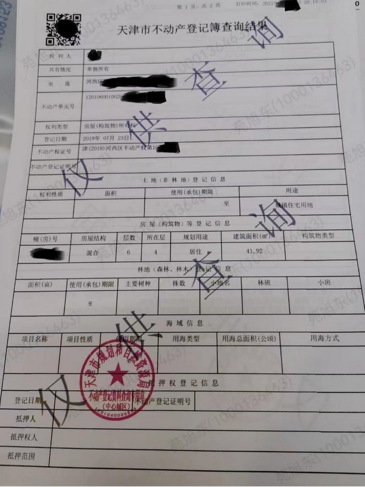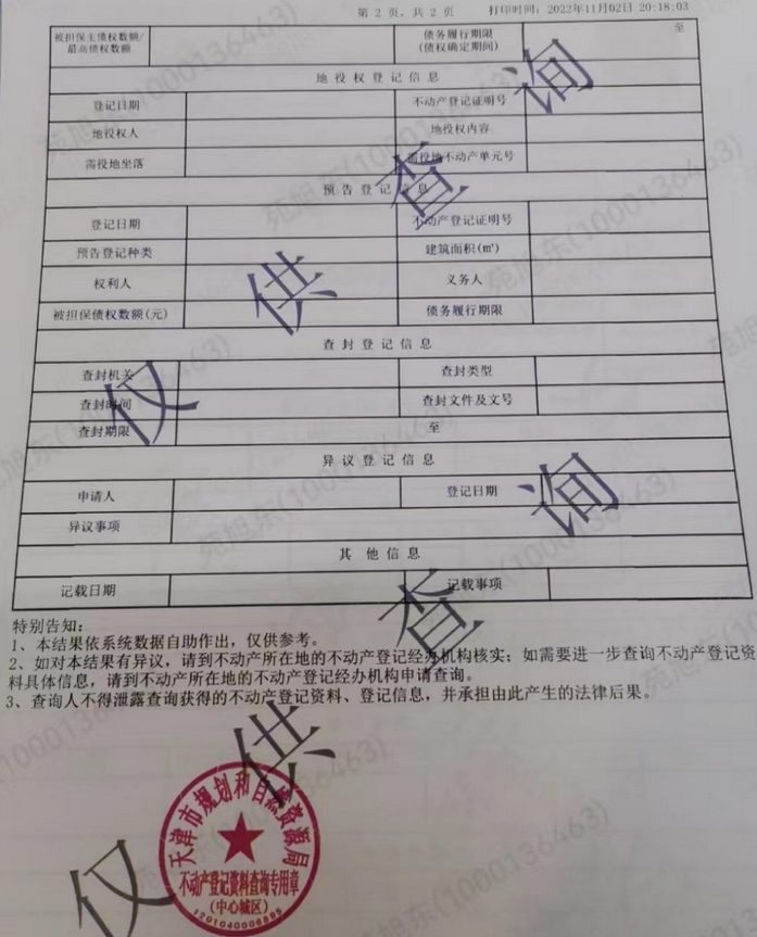 关于查封,最简单有效的办法就是查权属。全称:天津市不动产登记资料查询结果。