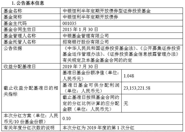 金融界基金8月7日讯 中银恒利半年定期开放债券(001035)今日公告,将于8月13日派发本年度第一次分红。本次分红方案为每10份基金份额分红0.10元。公告详情: