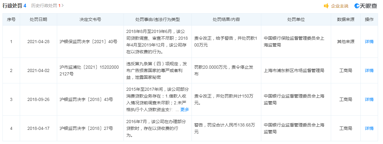 据悉,中银消费金融被处罚已非首次,天眼查数据显示,2021年4月2日,因“发布广告损害国家的尊严或者利益,泄露国家秘密”被处以罚款20万元;2018年9月26日,因“借款人收入情况贷前调查未尽职;未严格执行个人贷款资金支付管理规定;未采取有效方式跟踪检查贷款资金使用。”被罚款150万元。同年4月,因“存在以贷收费的行为”被罚款138.68万元。