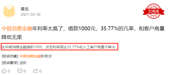 中国质量新闻网发现,在黑猫投诉中类似的投诉高发,有用户投诉在中银消费金融中借款1000元,年利率高达35.77%,这已经远超中银消费金融在官网中披露的年化利率。还有用户在网上诉苦,年化利率从一开始的8.5%,等手续办理完后年化利率变成了17.117%。在中银消费金融APP的产品介绍中并没有直接的显示年化利率,而是要点“立即申请”之后,在页面中,有一行小小的浅灰色的字,标注着大概的年化利率,具体利率要在合同中确定。