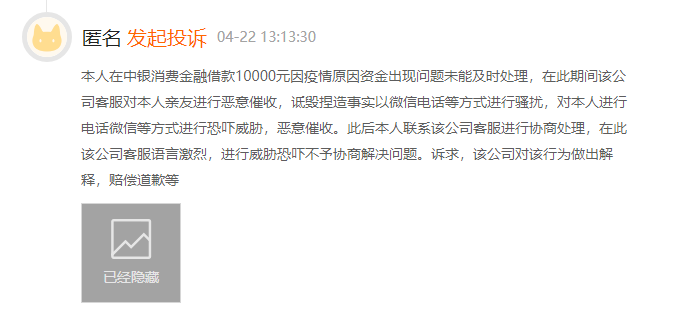 除了高利率的投诉,在黑猫投诉中还有大量关于恶意催收、高利息率的投诉信息。下图中借款人在结算期间,其家人收到中银消费金融的恶意催收,并诋毁捏造事实以微信电话等方式进行骚扰,威胁恐吓不予以协商解决。在黑猫投诉中恶意催收的投诉量占大半。根据相关法规,贷款人可以催告借款人还款,但是不能暴力催收,骚扰借款人的家人等。