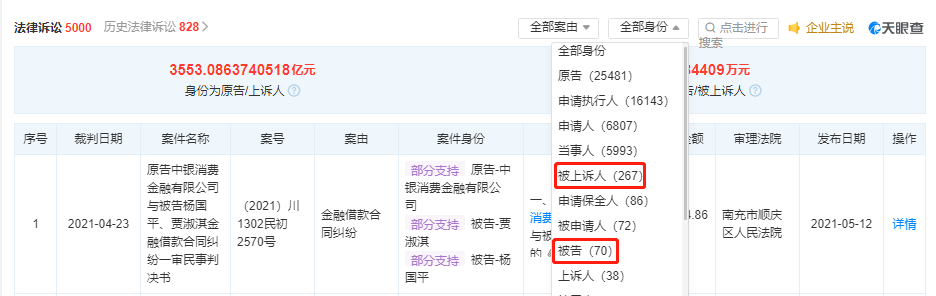 同时,天眼查中有关中银消费金融的法律诉讼多达5828起,中银消费金融处于被告的案件有70起、被上诉的案件有267起,90%以上的案件因“金融借款合同纠纷”而起。