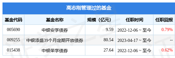 高志刚先生:中国国籍,硕士研究生,曾任招商证券债券研究员、天风证券固定收益高级分析师。2019年加入中银基金管理有限公司,曾任固定收益研究员、风控中台、基金经理助理。现任中银安享债券型证券投资基金基金经理。2022年12月6日起担任中银荣享债券型证券投资基金基金经理。2023年4月17日担任中银添盛39个月定期开放债券型证券投资基金基金经理。
