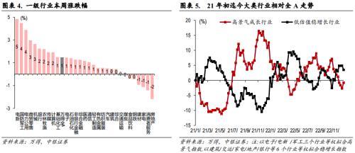 。我们在11月13日周报中提及“价值风格行业将展开短期修复,行业均衡预期再起”,主要逻辑基于疫情防控放开及地产政策带来的经济上行预期会支撑价值风格短期内再次展开估值修复,这一逻辑类似于22年一季度稳增长预期驱动的价值向上,而存量资金市场环境下,单边风格行业的边际改善不可避免会导致不同风格行业相对收益的跷跷板效应。