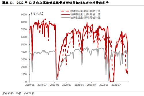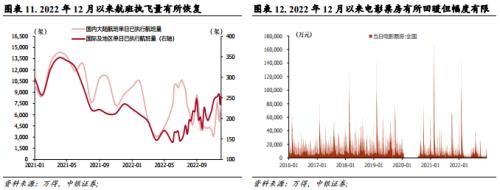 。2022年12月以来特别是“新十条”发布后,线下消费行情显著回暖,院线、酒店餐饮、旅游及景区、航空相较万得全A分别取得22.3%、18.5%、18.0%、13.8%超额受益,而相比之下,在第一波疫情冲击的影响下,线下消费基本面整体恢复相对缓慢,国内、国际执飞航班量尽管呈现回暖趋势,至12月底国内、国际单日执飞航班量分别达到7075架次、254架次,但整体较2021年平均水平的10796架次、272架次仍更低,票房近期有所回暖但幅度有限,北上深地铁客运量有所恢复但仍未回归疫情前水平,12月24日-12月29日当周,北上深地铁客运量分别恢复至2019年同期的35%、29%、47%,线下消费预期先行的趋势较为明显,但后续随各地疫情确诊逐步达峰回落,基本面修复有望进一步加速。