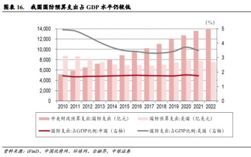 。12月8日,美国国会众议院通过2023财年的《国防授权法案》,法案通过了高达8579亿美元的2023财年国防预算,较2022年的7530亿美元增长近14%。值得关注的是,该法案要求在未来5年内加大力度协助台湾发展军事力量,授权美国从2023年至2027年,对台湾提供高达100亿美元为期5年的军事财政援助以及高达10亿美元的武器和弹药,同时将包括一项新的“军事贷款”担保授权,加快台湾武器采购速度,并制订训练计划提升台湾防卫能力。除美国外,12月23日,日本政府也通过2023财年政府预算草案,其中防卫预算高达6.8219万亿日元,为2022财年的1.26倍。法国国防部公布的2023财年的国防预算高达439亿欧元,相比2022年增加7.4%,法国还计划在未来2024财年和2025财年会持续每年增加30亿欧元预算军费。西班牙政府则称将确保将履行其对北约的承诺,到2029年国防投资将达到国内生产总值的2%,同时,根据西班牙政府2023年的国家总预算草案,西班牙2023年国防投资将从占据国内生产总值的1.01%增长至1.2%,国防投资将从91.91亿欧元增长至123.17亿欧元,国防投资增长幅度达到25.8%。美日及北约各国2023财年国防预算均呈现较大幅度增长趋势。相比之下,2022 年我国国防支出达 14504.5 亿元,同比增长 7.1%,为近5年来较高水平,但相较2023年主要强国军费增速仍性相对较低,占GDP比重也仍维持在较低水平,2021年占比仅约1.2%,展望2023年,在较为严峻的国际局势之下,我国军费开支有望进一步维持高增长。