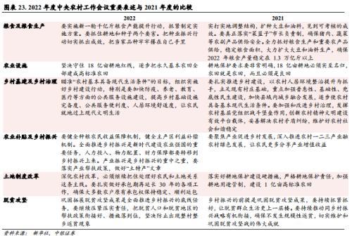 总体来看,近年来乡村振兴、农业强国等政策的针对性逐渐增强,从中央到地方均已明确要进一步推动人力投入、物力配置、财力保障都要转移到乡村振兴上来,全面推进农村产业、人才、文化、生态、组织“五个振兴”,为农业农村发展提供全方位支持。此次会议再次明确了当下农业建设的重要战略与方向,首先保障粮食和重要农产品稳定安全供给始终是建设农业强国的头等大事,同时积极利用新一轮科技革命要依靠科技和改革双轮驱动加快建设农业强国,推进农业现代化建设与农村三产融合发展,最后在坚持党的“三农政策”领导下全面推进乡村振兴、加快建设农业强国,积极落实党中央着眼全面建成社会主义现代化强国作出的战略部署。