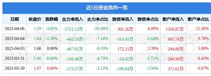 4月6日的资金流向数据方面,主力资金净流出1712.13万元,占总成交额19.39%,游资资金净流入361.26万元,占总成交额4.09%,散户资金净流入1350.87万元,占总成交额15.3%。
