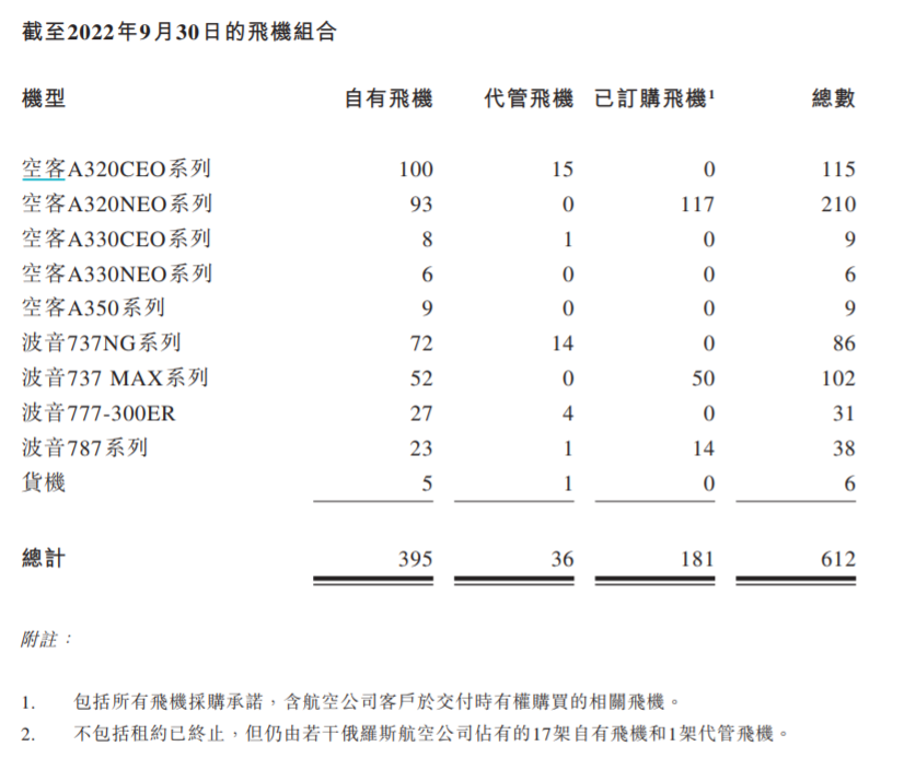中银航空租赁第三季度运营资料(截至2022年9月30日止)显示,其自有、代管及已订购的飞机共计612架;自有机队共有395架飞机,经账面淨值加权后的平均机龄为4.3年、平均剩余租期为8.2年。按机型来分,其中空客349架、波音257架,货机6架。