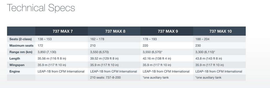 737MAX部分产品的数据对比 波音官网截图