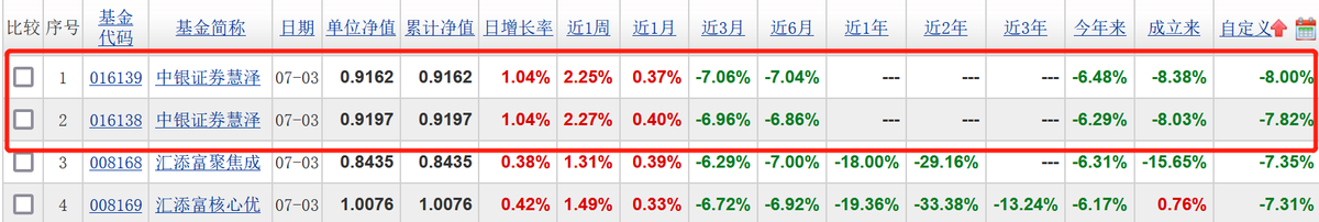 我们观察FOF基金产品发现,长城基金旗下的长城恒泰养老2040三年持有混合,2023年上半年取得5.85%的涨幅,成为了半年度FOF产品冠军。而半年度垫底的FOF产品是来自中银国际证券股份有限公司(下称“中银证券”)的中银证券慧泽进取3个月持有期混合(下称“中银证券慧择进取3个月”),该基金的C份额上半年跌幅达8%。
