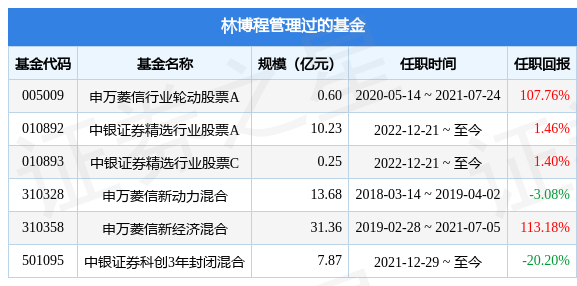 林博程先生:硕士,2012年起从事金融相关工作,曾任职于永诚财产保险股份有限公司、招商证券股份有限公司、华泰证券股份有限公司。2013年9月至2014年4月任职于招商证券股份有限公司,担任银行业分析师;2014年4月至2015年10月任职于华泰证券股份有限公司,担任银行业分析师;2015年10月至2021年7月任职于申万菱信基金管理有限公司,担任基金经理;2021年7月加入中银国际证券股份有限公司基金管理部。2015年加入申万菱信基金管理有限公司,曾任行业研究员、基金经理助理,现任申万菱信新动力混合型证券投资基金基金经理,2020年5月14日至2021年7月24日担任申万菱信行业轮动股票型证券投资基金基金经理。2019年2月28日至2021年7月5日担任申万菱信新经济混合型证券投资基金基金经理。2021年12月29日担任中银证券科技创新3年封闭运作灵活配置混合型证券投资基金基金经理。2022年12月21日起担任中银证券精选行业股票型证券投资基金基金经理。