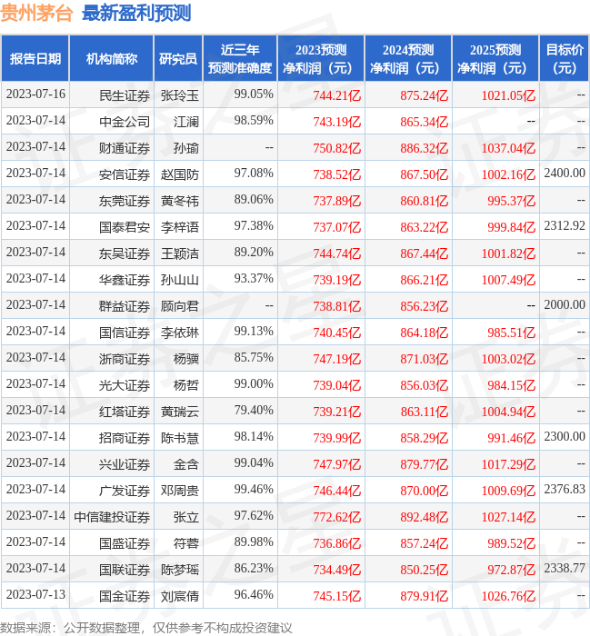 最新盈利预测明细如下: