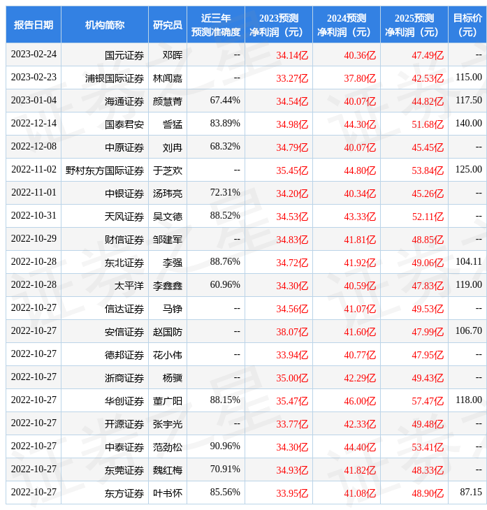 证券之星数据中心根据近三年发布的研报数据计算,中泰证券范劲松研究员团队对该股研究较为深入,近三年预测准确度均值高达90.96%,其预测2023年度归属净利润为盈利34.3亿,根据现价换算的预测PE为44.75。
