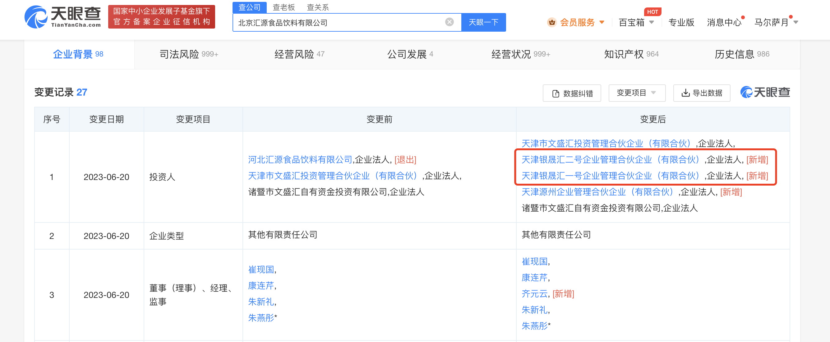 近日,记者从天眼查App获悉,北京汇源食品饮料有限公司发生工商变更,河北汇源食品饮料有限公司退出投资人行列,新增中银资产基金管理有限公司旗下2家合伙企业天津银晟汇一号企业管理合伙企业(有限合伙)、天津银晟汇二号企业管理合伙企业(有限合伙),以及天津源州企业管理合伙企业(有限合伙)为投资人。